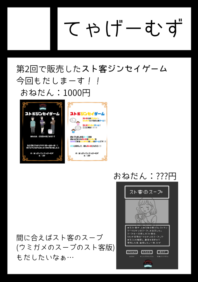 スト客をテーマにしたジンセイゲームだします!だせたらスト客のスープ(ウミガメのスープのスト客版)もだしまーす!
