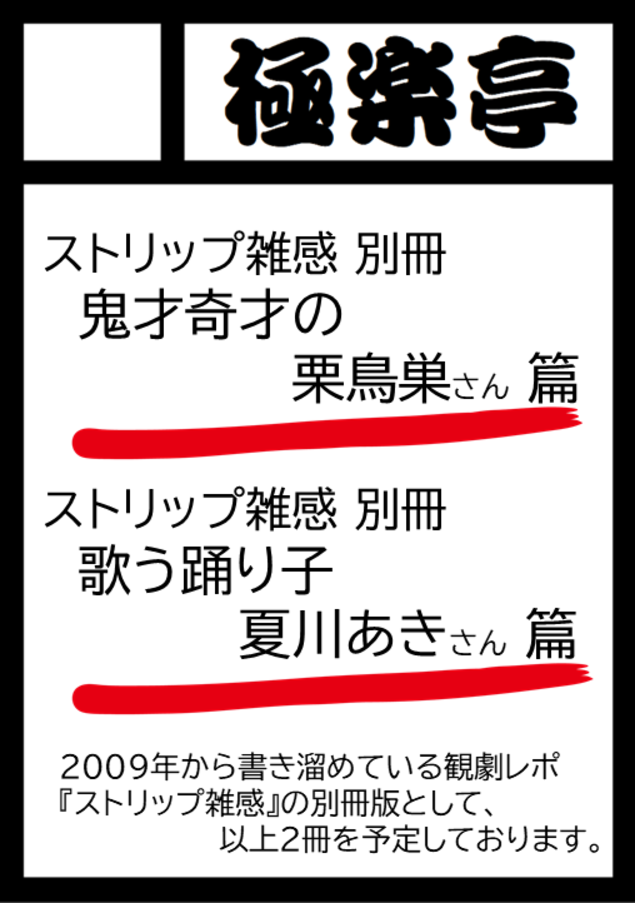 『栗鳥巣さん』そして『夏川あきさん』を中心とした観劇レポ本を各1冊予定しています。