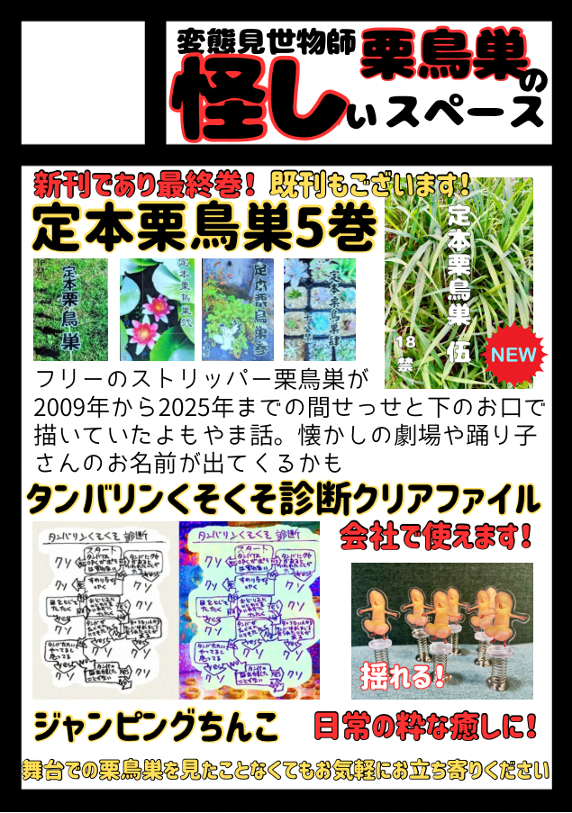 栗鳥巣が2009年から2025年までストリップ劇場で配布していたペーパーを本にまとめた「定本栗鳥巣」がメインコンテンツのサークルです。