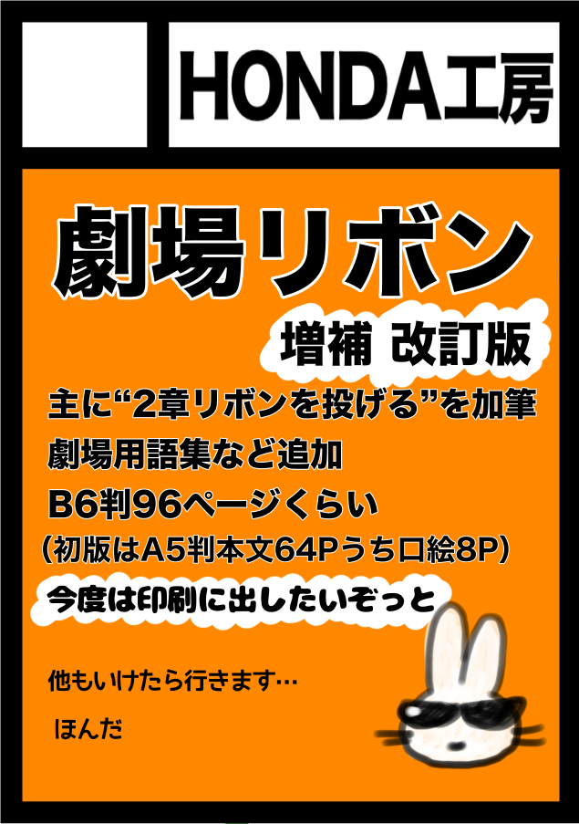 HONDA工房でございます。劇場でリボンを投げる本。春の文化祭で出したものを大幅加筆改訂。今度はちゃんと印刷に出したいぞっと。